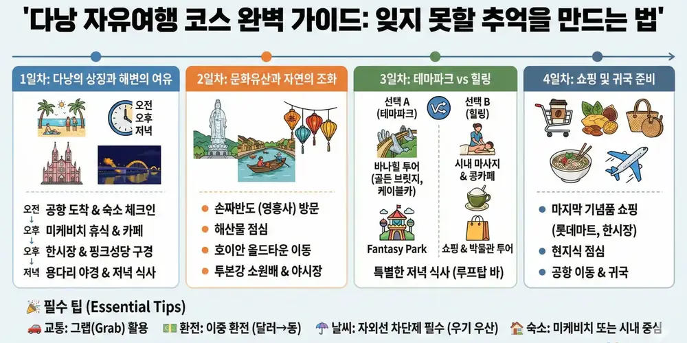 다낭은 아름다운 해변, 풍부한 문화유산, 그리고 저렴한 물가로 사랑받는 여행지입니다. 복잡한 패키지 일정 대신, 나만의 속도로 도시를 탐험하며 진정한 매력을 발견해보세요. 여러분의 특별한 여행을 위해 최적의 동선과 필수 팁을 정리했습니다.